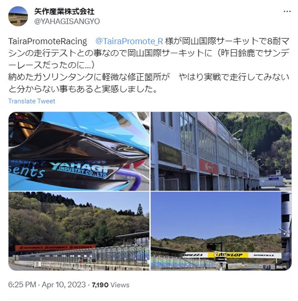 4月10日、岡山の国際サーキットにて、Taira Promote Racingさんが8耐マシンの走行テストを実施。昨日鈴鹿でレースをしたばかりなのに、頭が下がる思いだ。
