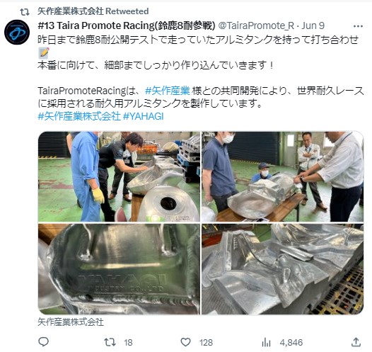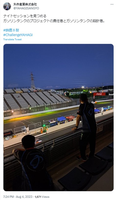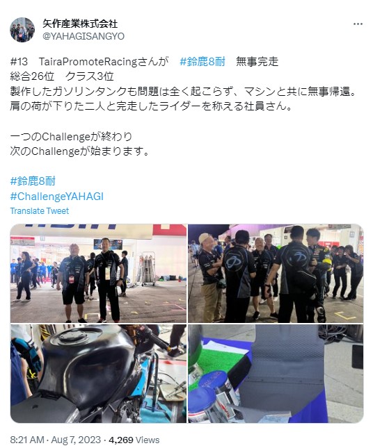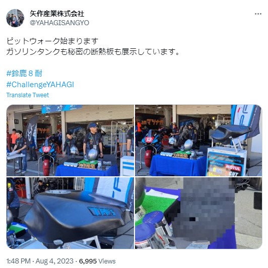チームに促されてピットウォーク(走行前のピットを開放するファンサービス)の際にも展示させていただき、観客の方々にも製作した予備のガソリンタンクや、矢作産業の金属加工技術を見てもらうことができた。