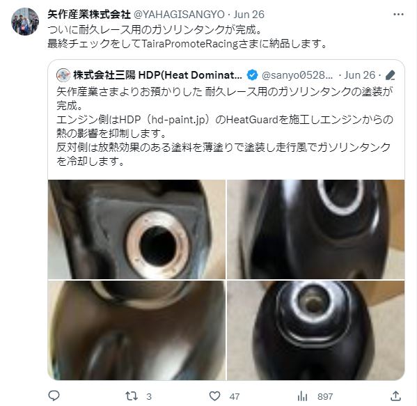 余談ではあるが、株式会社三陽さんのHDP(Heat Dominator Paint)は、Taira Promote Racingさんのマシンにも取り入れられ、エキマニには断熱型、ラジエーター等には放熱型が採用されている。
